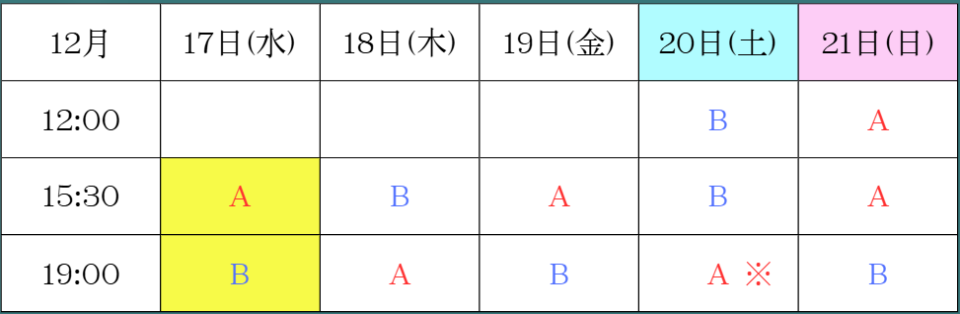 ※12月20日(土)19時公演のみAチームの12号役として代打で出演いたします。